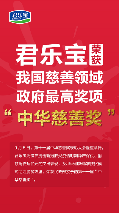 9月5日,第十一屆中華慈善獎表彰大會隆重舉行,君樂寶憑借在抗擊新冠肺炎疫情時期穩產保供、捐款捐物超億元的突出表現,及積極創新精準扶貧模式助力脫貧攻堅,榮獲民政部授予的第十一屆“中華慈善獎”。