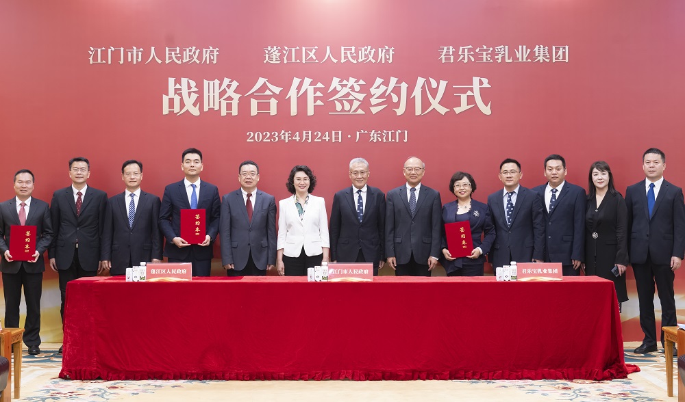 4月24日,君樂寶乳業集團與廣東省江門市人民政府、蓬江區人民政府簽署戰略合作協議,君樂寶將在江門市蓬江區投資建設華南液態奶基地項目。江門市委副書記、市長吳曉暉,中國科學院院士、君樂寶科學戰略智庫主席王恩哥,君樂寶乳業集團董事長兼總裁魏立華出席簽約儀式。