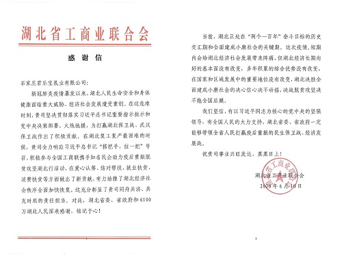 信中同時表示:湖北正處在“兩個一百年”奮斗目標(biāo)的歷史交匯期和全面建成小康社會的關(guān)鍵期。疫情短期內(nèi)為湖北經(jīng)濟(jì)社會發(fā)展帶來陣痛,但湖北決勝全面建成小康社會的決心信心不動搖。君樂寶本次捐贈的暖心之舉,有力助推了湖北經(jīng)濟(jì)社會秩序全面加快恢復(fù),彰顯了同舟共濟(jì)、共克時艱的責(zé)任擔(dān)當(dāng)。對此,湖北省委、省政府和6100萬湖北人民深表感謝,銘記于心。